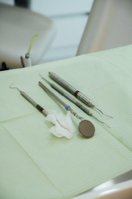 PDF guides illustrating dental instruments highlight essential examination tools. The mouth mirror aids visibility, while the dental explorer detects caries and irregularities. These instruments, often pictured in detail, are foundational for initial patient assessments.